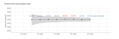 As it stands, we tend to be quite close to the predictions for the vote share (polls are slightly in favour of Leave, while other prediction methods are slightly in favour of Remain), but we tend to be a bit far from the probability estimates (the reasons for which are described above – if our error was lower, our probabilities would have also been around 70:30 in favour of Remain).